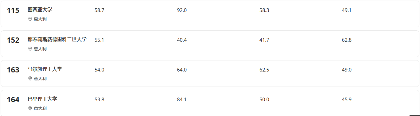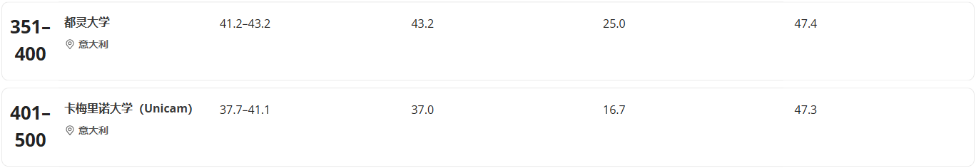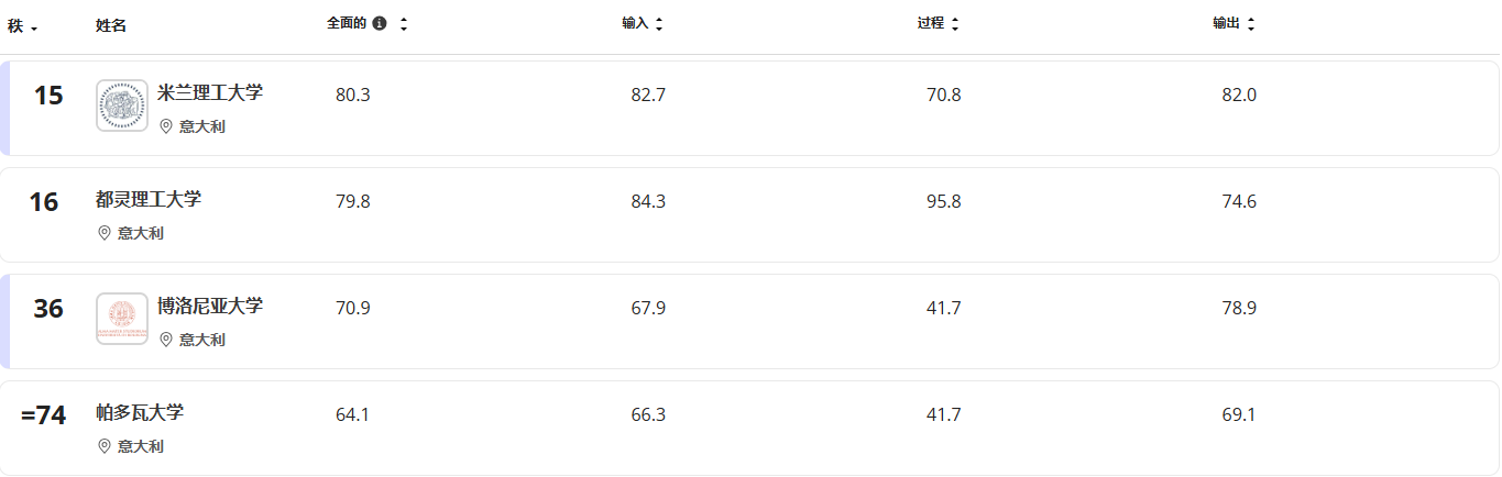 而意大利的其他院校,在此次排名中也表现优异,共15所意大利院校进入全球排名前500: