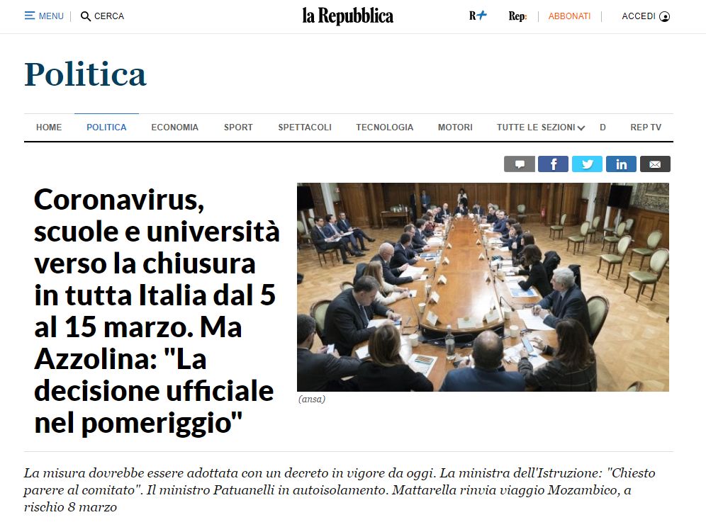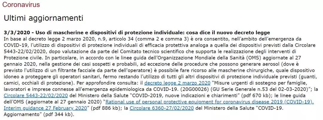 也就在今天下午,意大利高等卫生研究院(Iss)终于通过了2020年3月2日第9号法令34条文(第2、第3条款),在新冠肺炎疫情紧急情况下,允许使用口罩等作为个人防护措施。根据世界卫生组织(WHO)1月27日发布的最新准则,在处理确诊和疑似病例时,除使用手套、工作服、防护眼镜等防护用品外,还可使用外科口罩作为医务工作者的防疫用品。