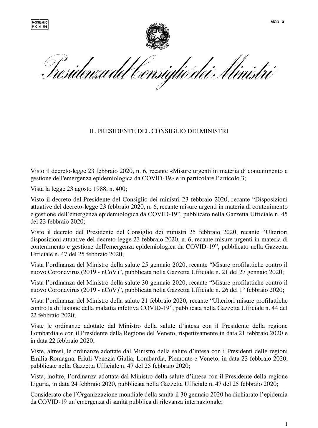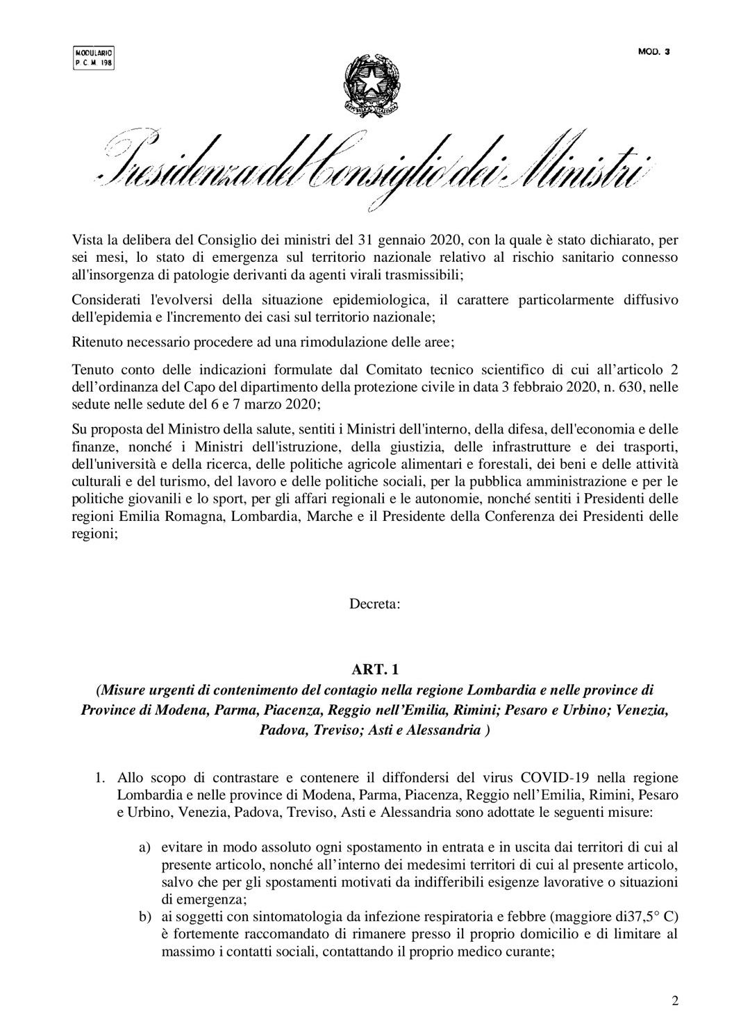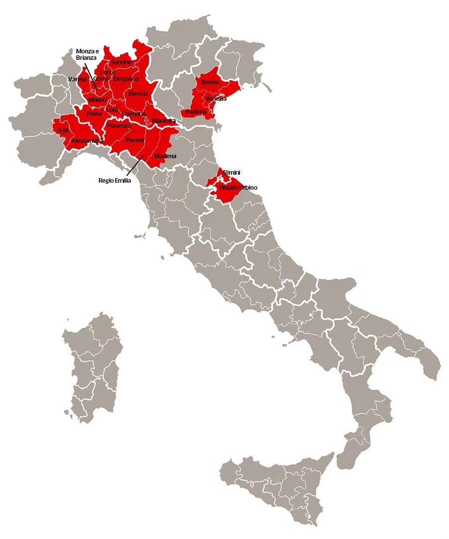 3月7日晚20:40,意大利政府就遏制Covid-19发布新的紧急法案:整个伦巴第大区以及摩德纳、帕尔马、皮亚琴察、雷焦艾米利亚、里米尼、佩萨罗-乌尔比诺、威尼斯、帕多瓦、特雷维索、阿斯提、亚里桑德里亚被列为红色区域。